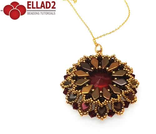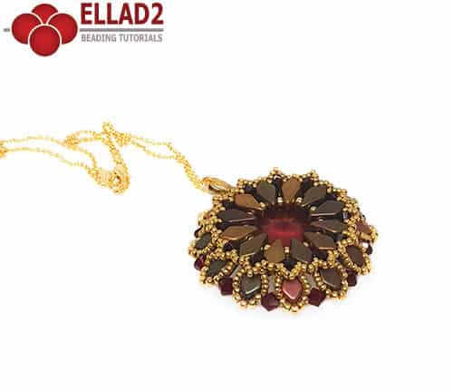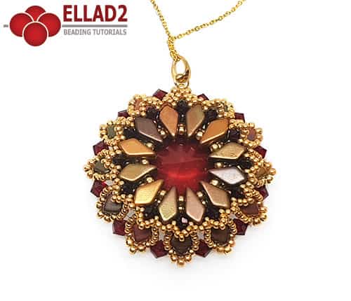 Een hele dieprode Swarovski ultra ruby Rivoli in combinatie met de Metallic Iris Satin Kite beads en goudkleurige rocailles maken deze bloemvormige hanger een elegant geheel.